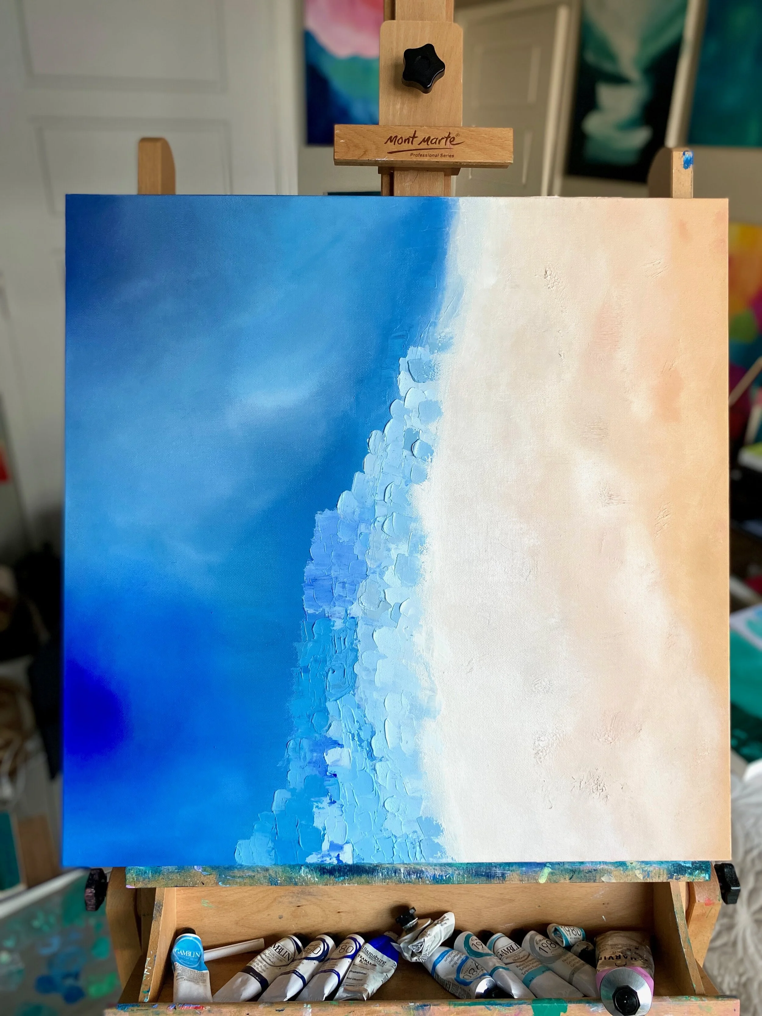 Interpreting landscapes, beaches, florals or other imagery with thick strokes and applications of oil paint for a partially abstract effect.